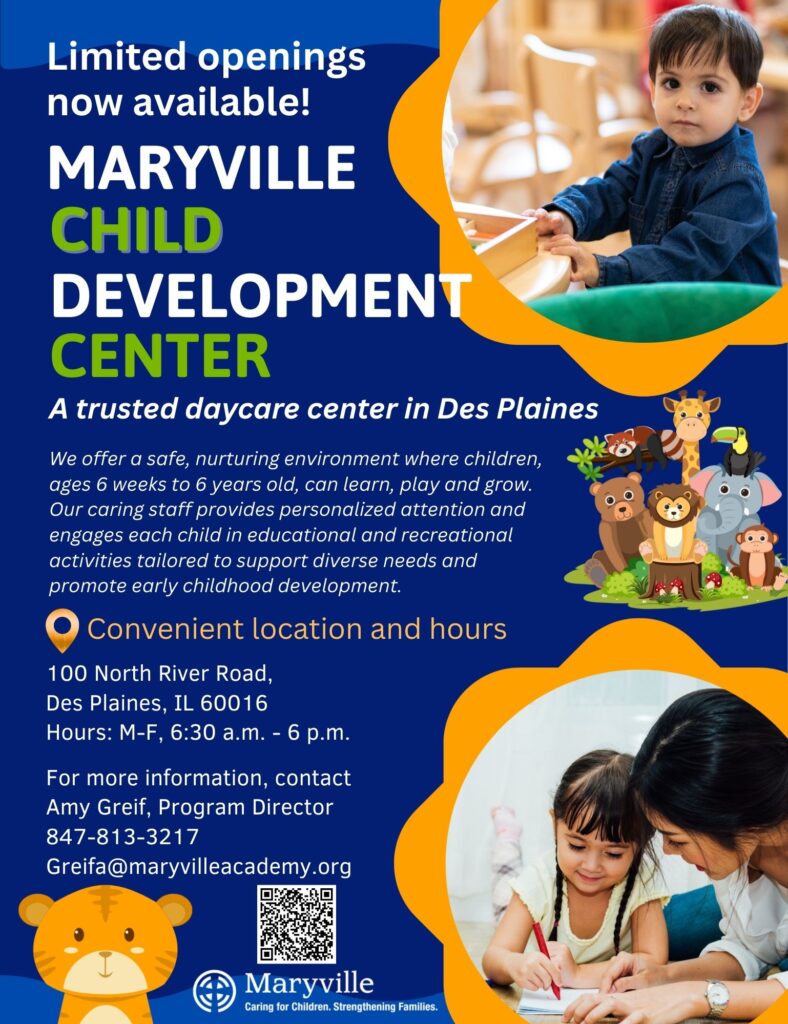 The Maryville Child Development Center currently has limited openings. Families interested in learning more or scheduling a tour may contact Amy Greif at [email protected] or call 847-813-3217.