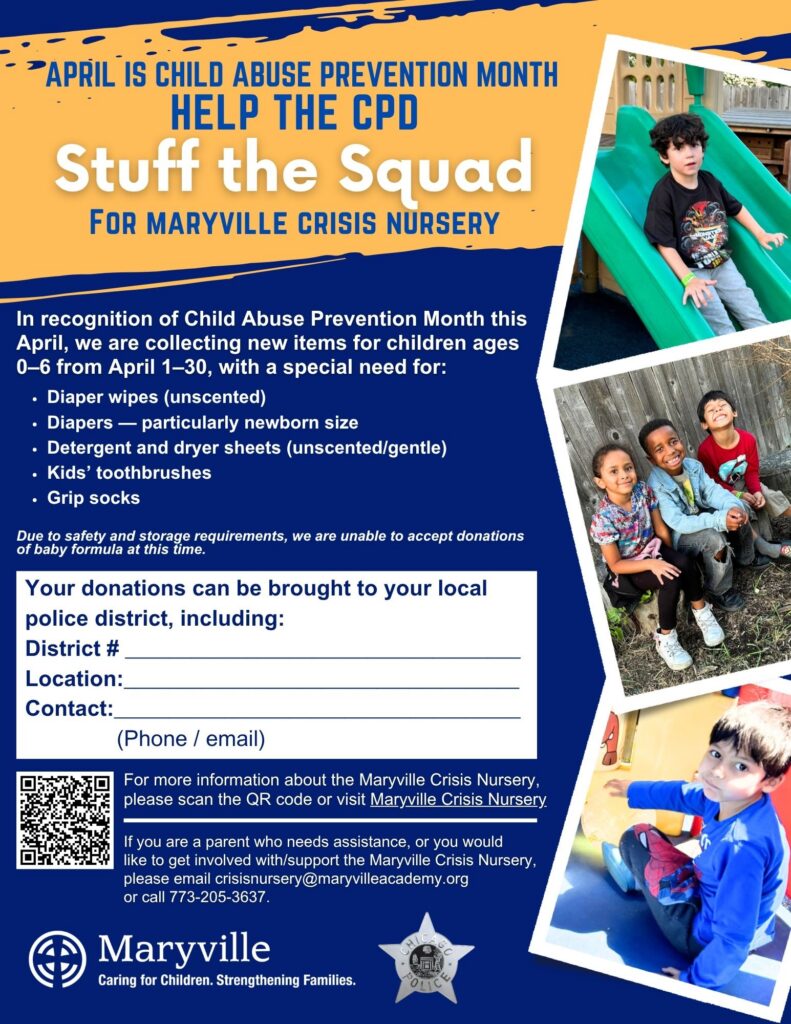 In recognition of Child Abuse Prevention Month this April, Maryville Academy is partnering with the Chicago Police Department to host “Stuff the Squad,” a monthlong donation drive supporting the Maryville Crisis Nursery. The initiative invites the community to help provide essential, day-to-day items for children ages 0 to 6 and the families who rely on the Nursery’s care and support.