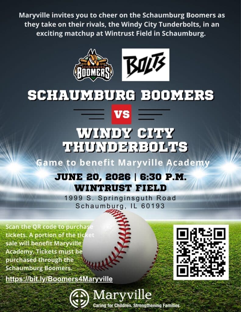A portion of every ticket sold will benefit Maryville, helping advance its mission of protecting children and strengthening families. Tickets must be purchased through the Schaumburg Boomers website to ensure proceeds are directed to Maryville.