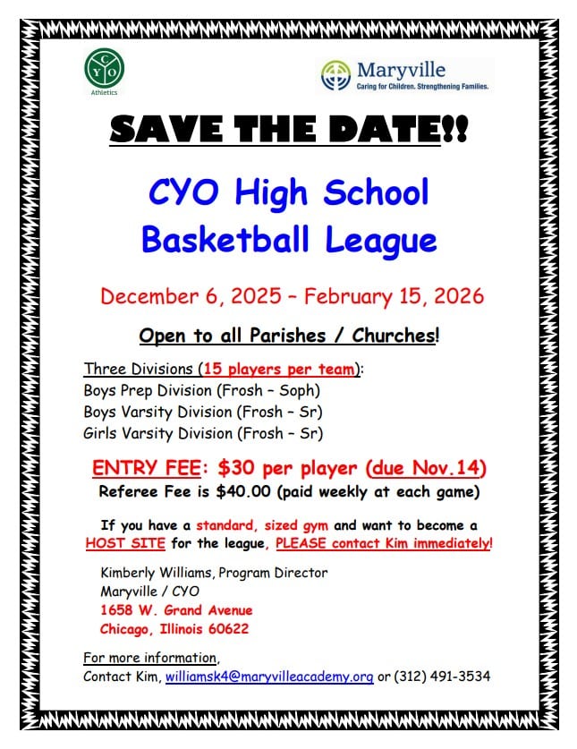 The 2025 – 2026 CYO High School Basketball League will be held weekends from December 6, 2025 to February 15, 2026. Three Divisions (Fr-So, Jr-Sr and Girls Fr–Sr) are open to all parishes and churches.